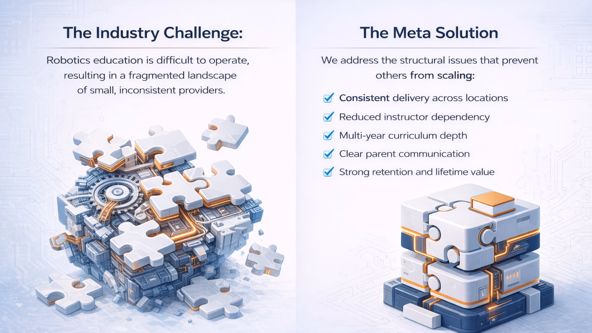 Meta Robotics is a vertically integrated robotics education business combining proprietary curriculum IP, purpose-built education hardware, and scalable delivery models to drive long-term retention and recurring revenue.